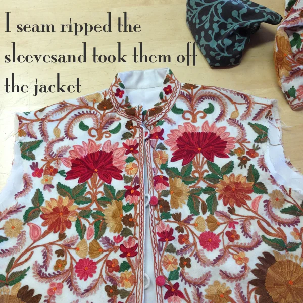 After seam ripping the sleeves off the jacket, I drew a new armhole on the jacket, making the shoulders 2" smaller on each side. This made the armhole quite a bit larger than the sleeve.