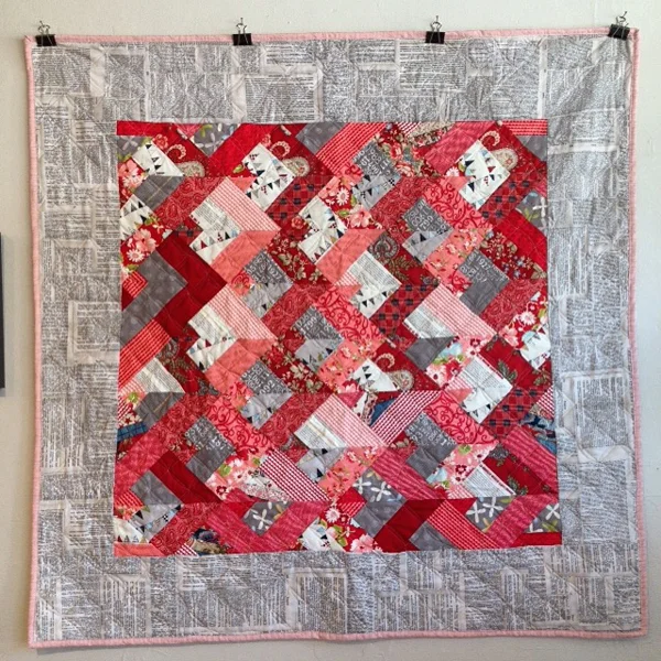 I then sewed the squares + some triangles onto each other, following a diagram in the book. It eventually turned into this terrific pattern, creating the quilt topper. Because my Jelly Roll was a partial (and home made) roll of fabric, there was not enough to follow the full size pattern in the book. My quilt is a square instead of a rectangle, but I'm OK with that.