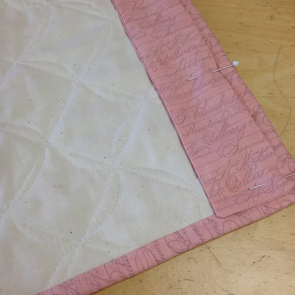 Here you can see a closeup of the back of the quilt that shoes the pretty pink fabric I used for the binding. I also created a channel with the same fabric. This is for a rod to hang on the wall with a dowel.