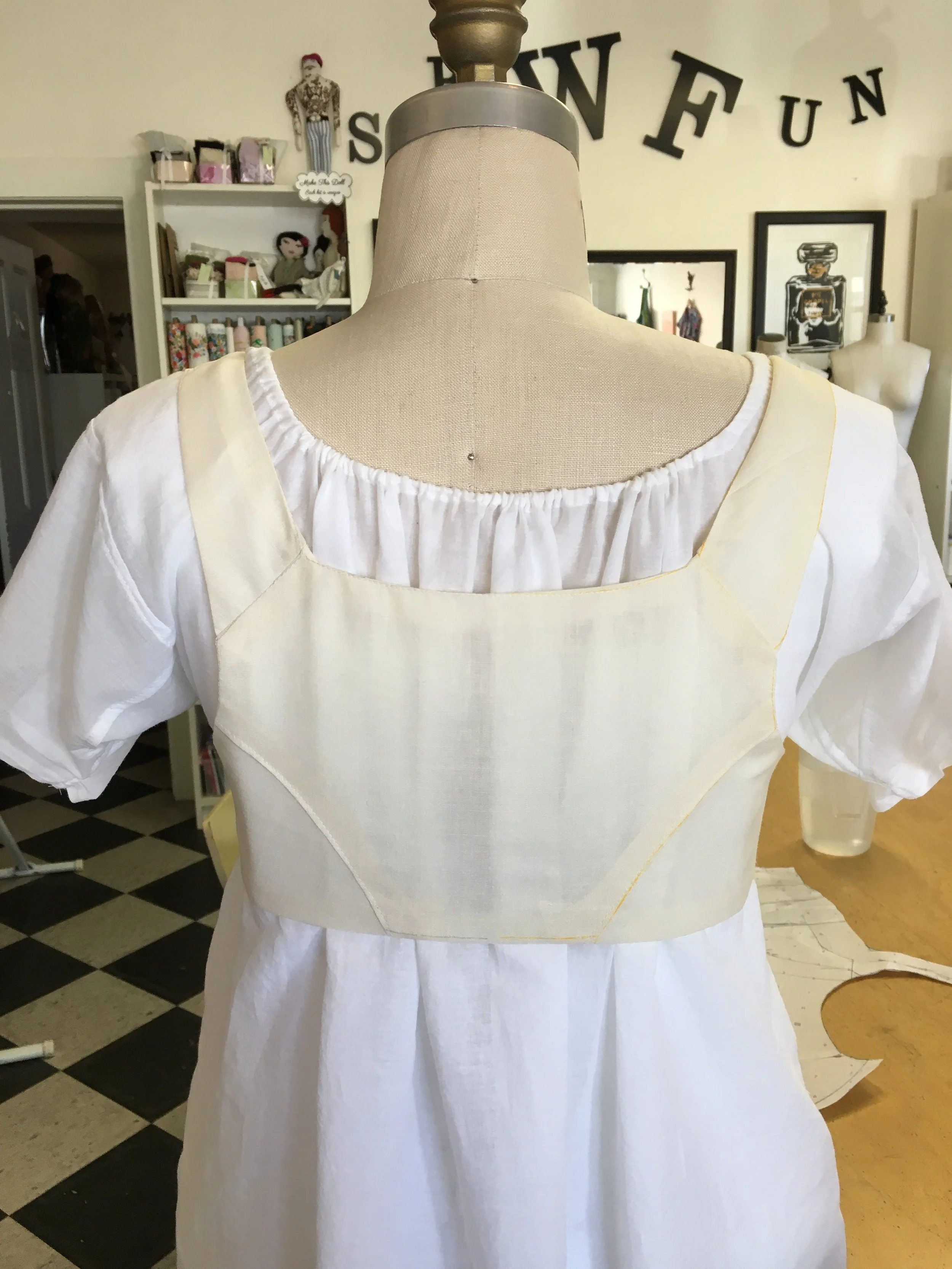 I added four pleats at the bottom to help the skirt stand out a bit. The back of the skirt is pleated at the waist from side to side, with no pleating in the front. Originally, I had pleated the sides of the front skirt as well, but that made it look too puffy at the waist and hip area. The line is really supposed to be more column like, from the empire waist, flaring slightly at the bottom edge.