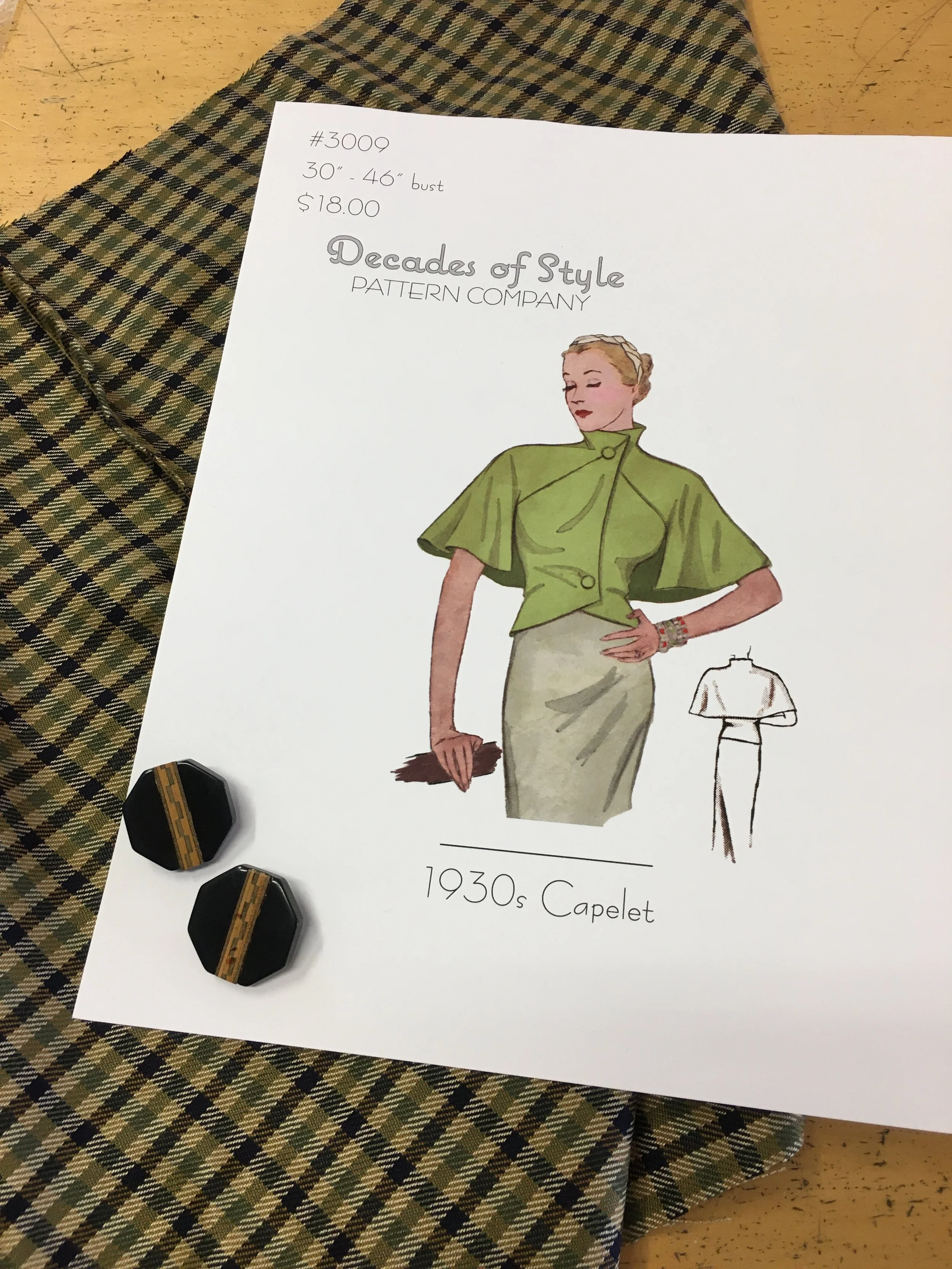 Above you can see a close up of my fabric and button choice along with the Decades of Style # 3009 1930’s Capelet pattern.
