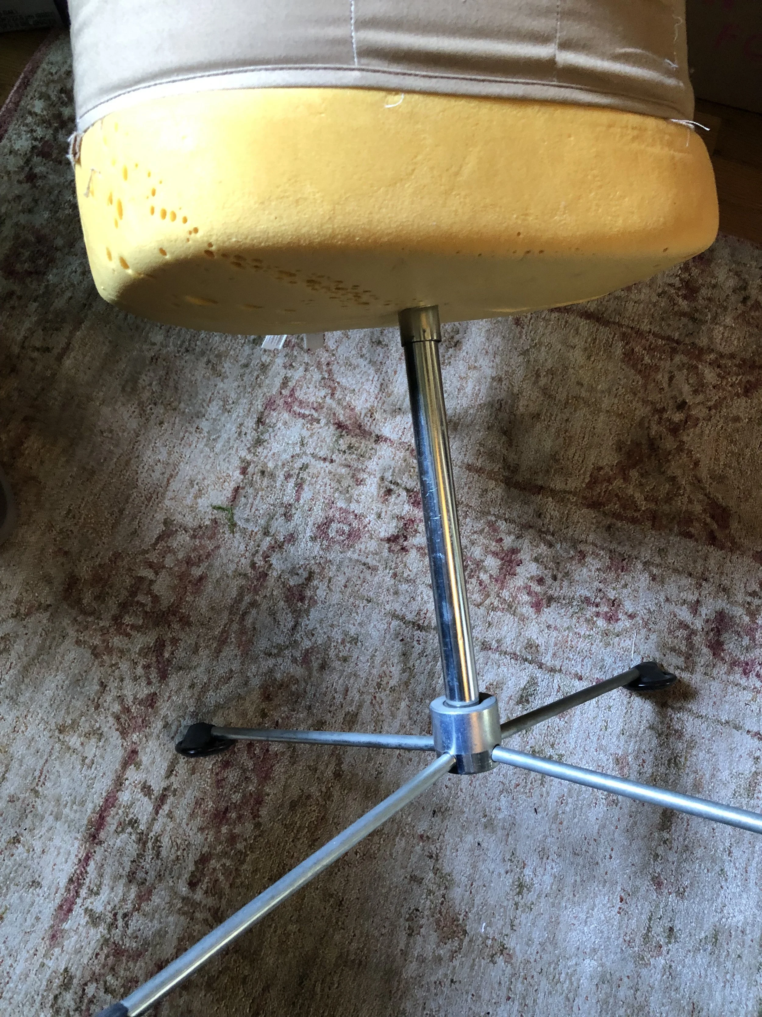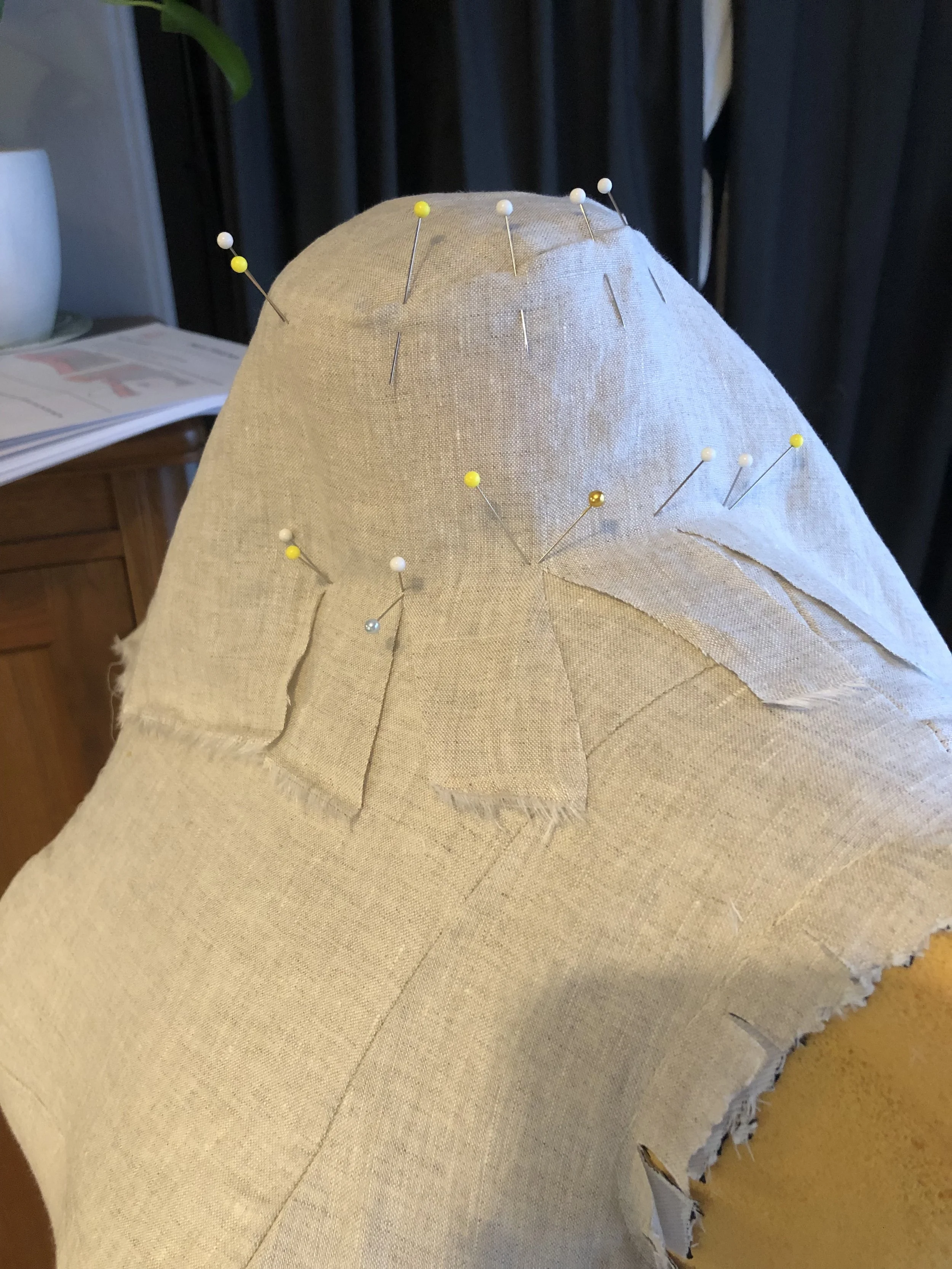 For fabric, I decided to use a linen curtain that I thrifted. It was lined with a black out fabric, which I decided to use as interlining to stabilize the linen. Because this linen is somewhat delicate, the pressure of the seams squeezing down the foam was going to be too much for it to handle. So when I cut out the pieces I cut out the black out fabric as well and marked the seam allowance and dart lines on that fabric. The linen was then hand basted to the blackout fabric, before stitching the darts and pieces together.