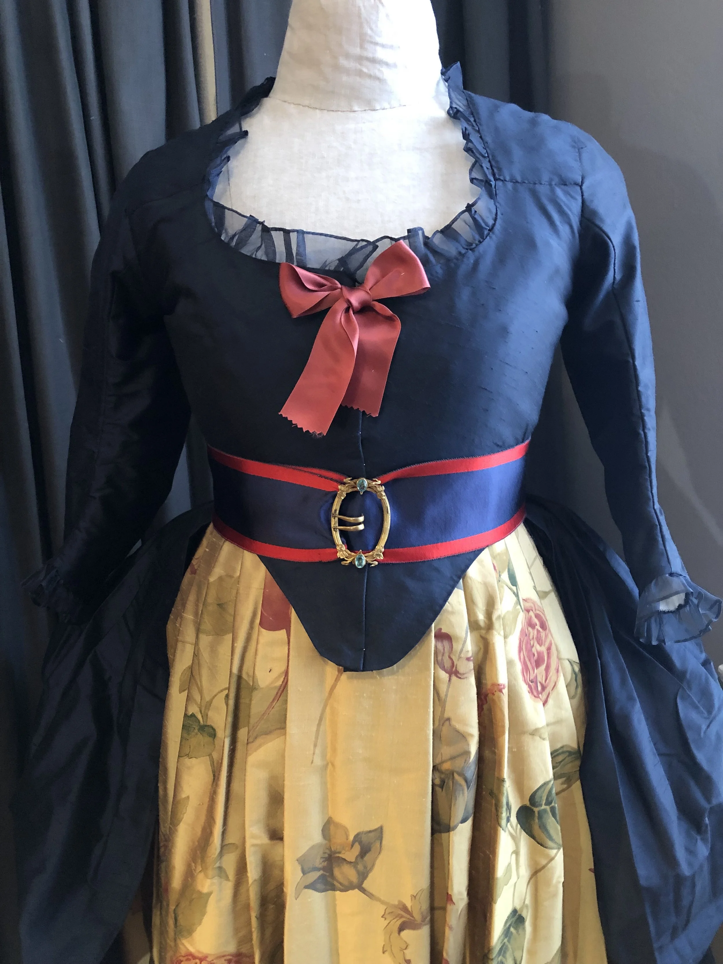 I’m about 80% happy with this form. The body and neck are great. Even though, the neck is actually a little bit too large in circumference, compared to mine, I think I can work with it. The sleeve/arm nubs, however, make the shoulder too wide. It was quite difficult to get this 18th century gown to fit around the front, because of the arms. I may just need to pull the stays tighter, so the rib cage part fits better, however, I really think the problem is the shape and size of the shoulders. I have slightly narrower shoulders (than the form) so I’m tempted to take the linen off , cut off the foam arm/shoulder nubs and use detachable arms for fitting. But not right now. Right now it is fine AS IS and I’m super happy to have a dress form at home for the low low cost of $42 total including the form + the linen curtain purchased 2nd hand + sales tax.