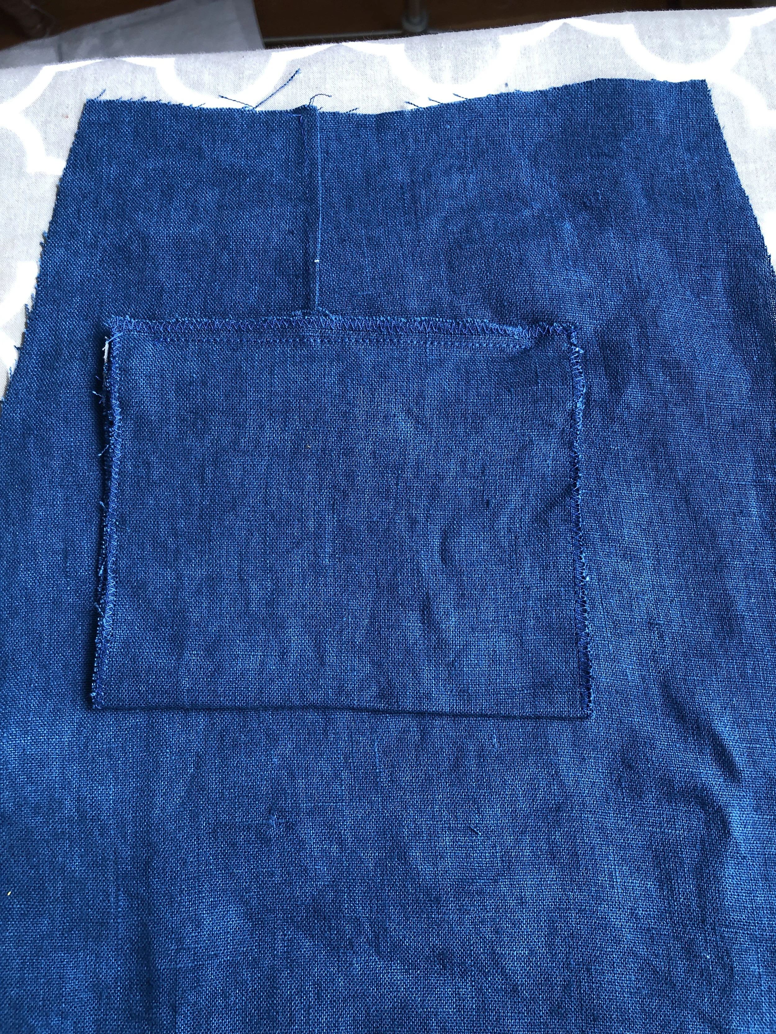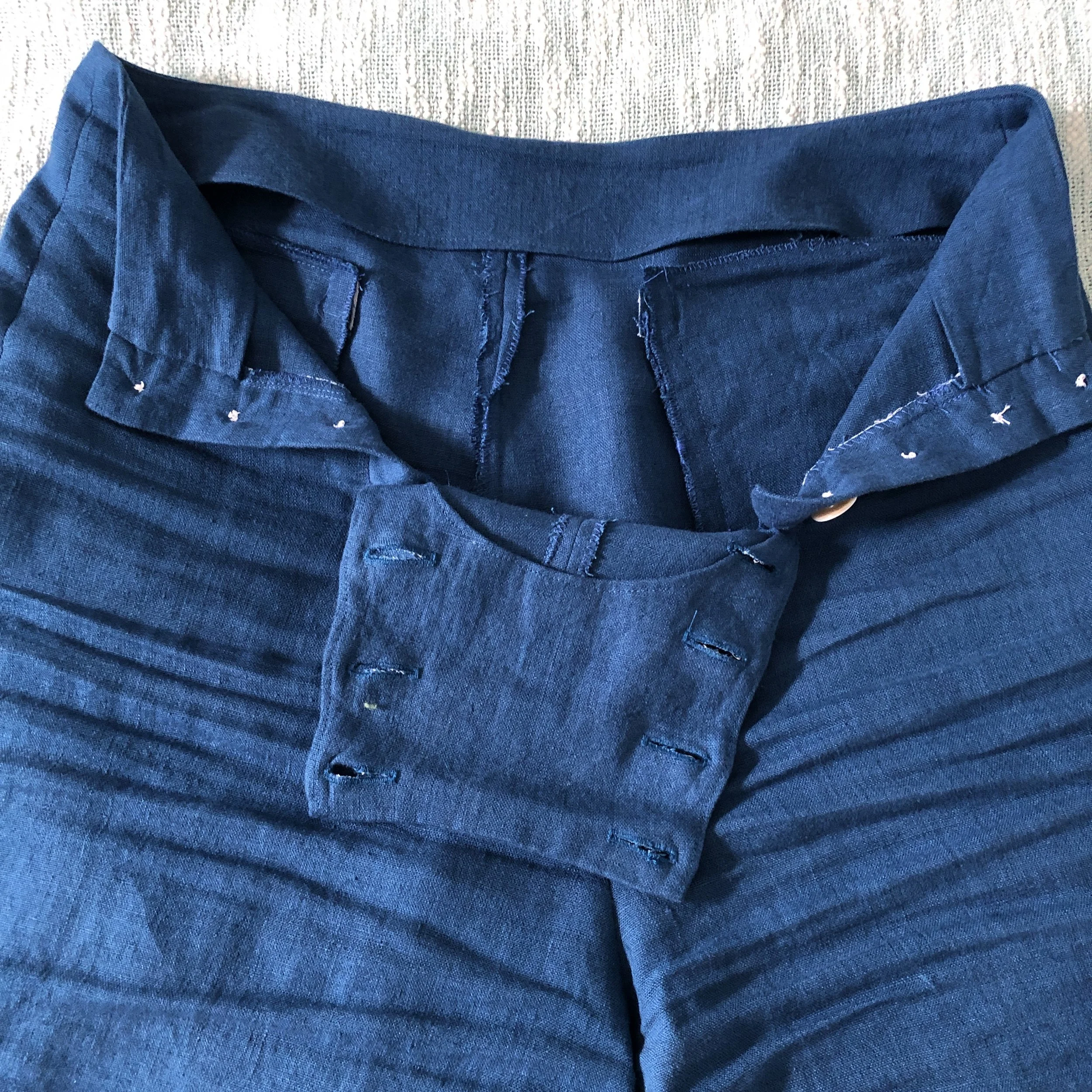 Instead of using the front darts as fabric intake, I decided to make a functional fall front by slashing down the middle of the dart and stitching a button extension to one side and finishing the other with a facing. I also made a facing for the rest of the waistline as the original waistline was finished with a bodice on the pajamas. The final touch was adding welt pockets at the back which I’ve illustrated below in photographs.
